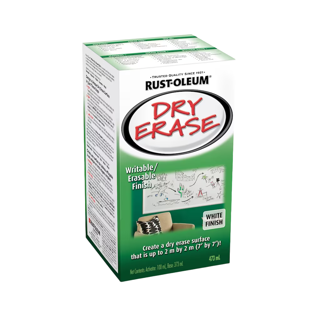 Rust-Oleum Dry Erase Paint delivers a smooth, durable finish that creates a white, writeable and erasable surface. Easy to apply with minimal odour, it’s safe for indoor use on drywall, wood, masonite, cement, and metal.